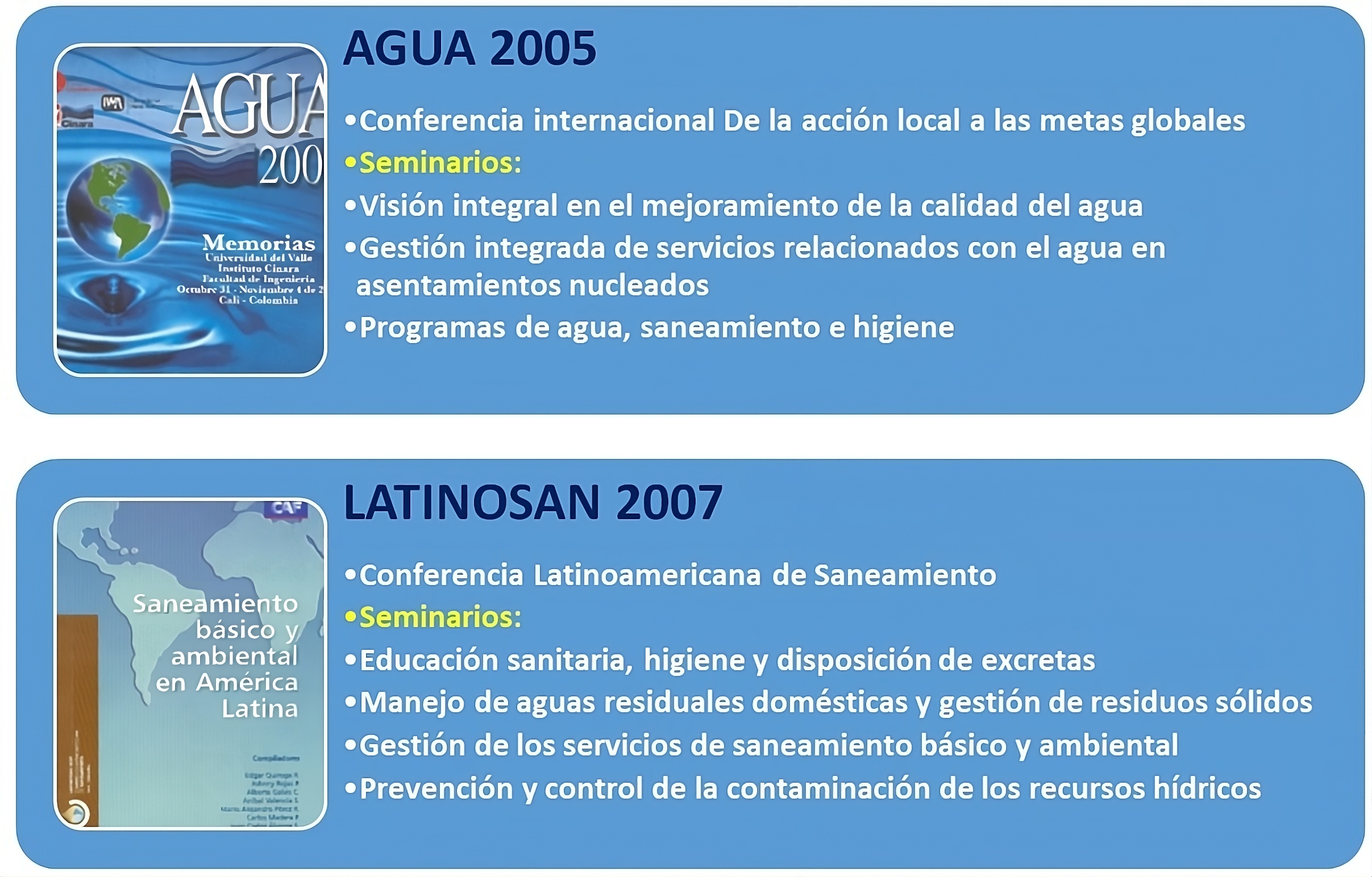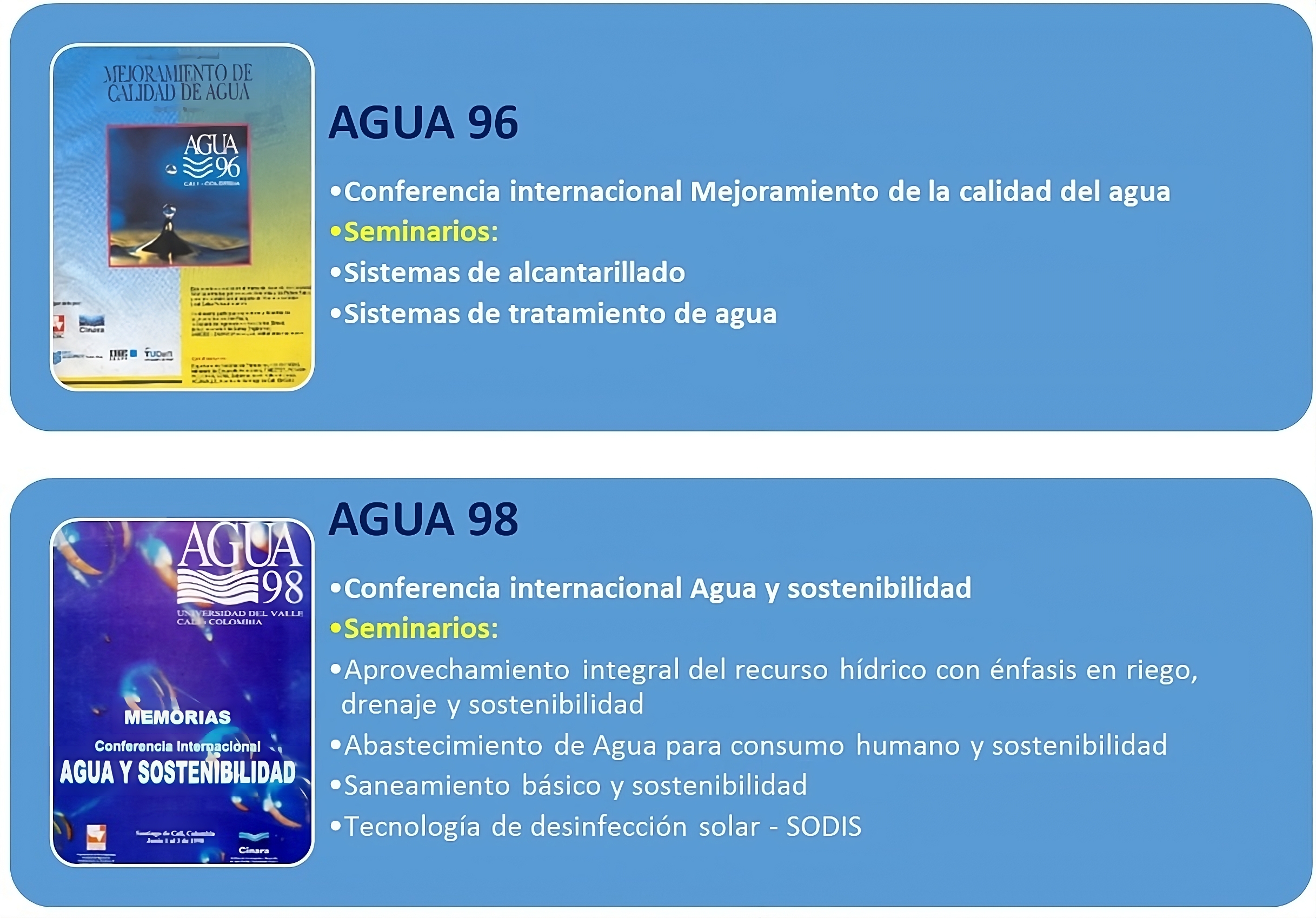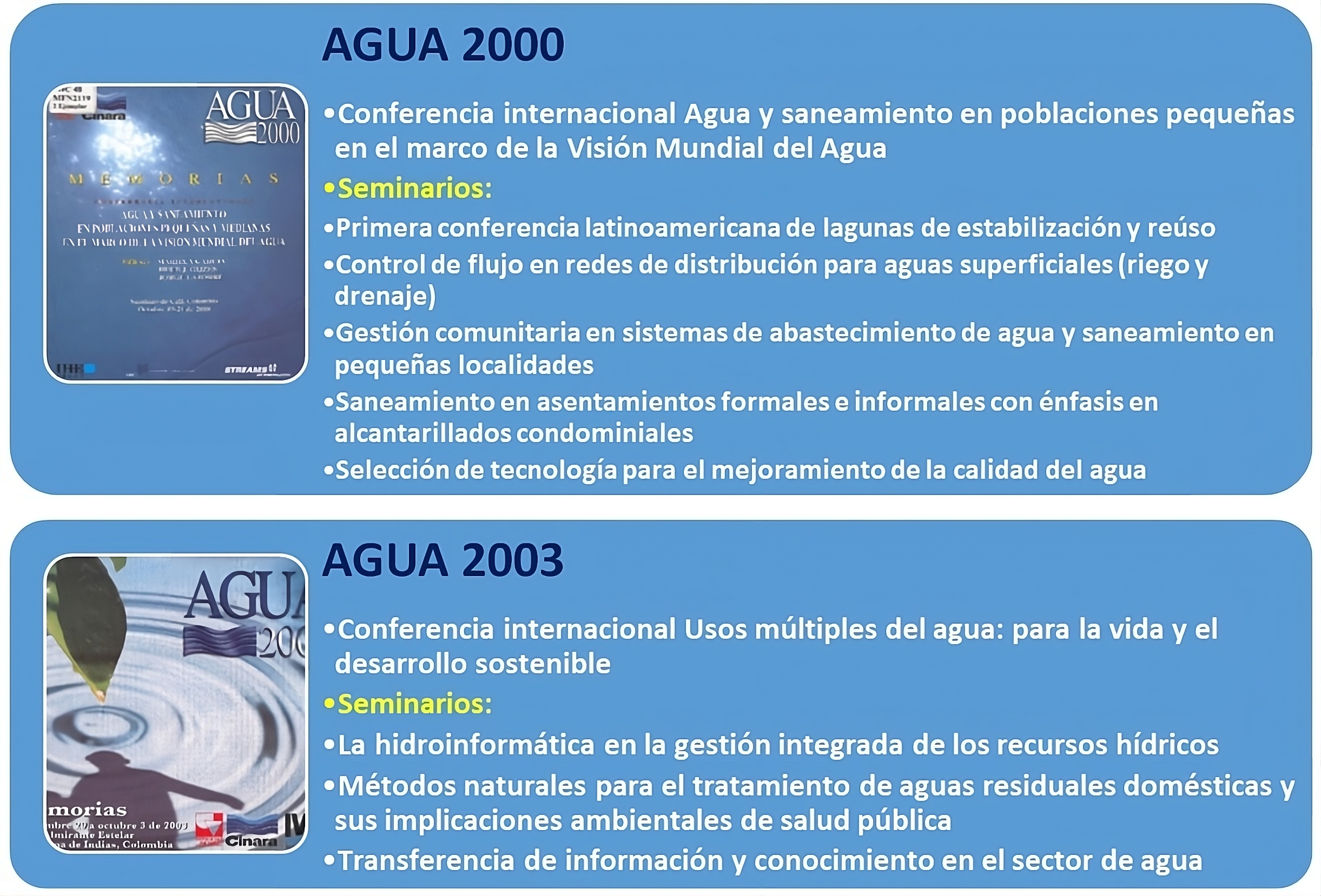 Las memorias, resultados de cada evento, pueden consultarse en el Centro de Documentación. Los siguientes son los nombres de las conferencias internacionales y los seminarios de las diferentes versiones de AGUA realizadas hasta la fecha: